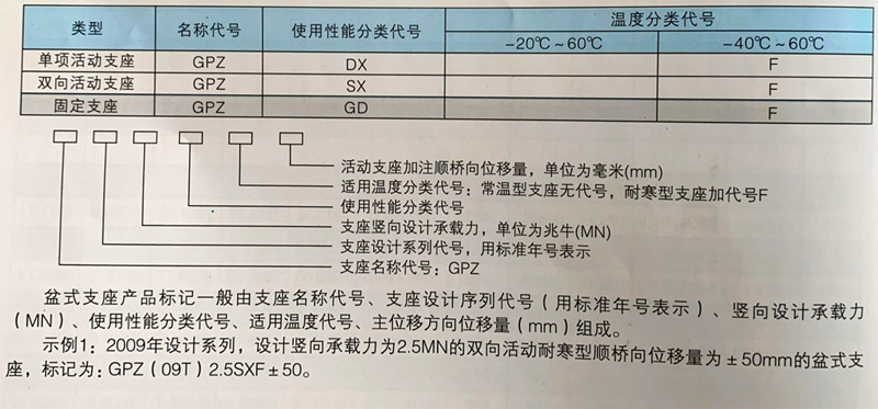 本系列盆式支座為中華人民共和國(guó)交通行業(yè)標(biāo)準(zhǔn)《公路橋梁盆式支座》( JTT391-2009 )的通用設(shè)計(jì), 系列通用設(shè)計(jì)圖名稱為公路橋梁盆式支座系列通用圖,系列 通用圖代號(hào)為GPZ (09T)0.4-60(DX、SX、 GD),系列支座型號(hào)為GPZ