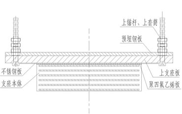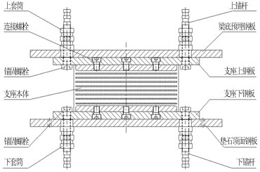 Ⅱ型——支座與墩、梁之間采用套筒連接,支座底面不設預埋鋼板,底鋼板和套筒之間采用錨固螺栓連 接,上預埋板與頂鋼板之間采用卡榫連接,上預埋鋼板與套筒之間采用配合焊接。 HDR(Ⅱ)高阻尼隔震橡膠支座結構示意圖(固定型)
